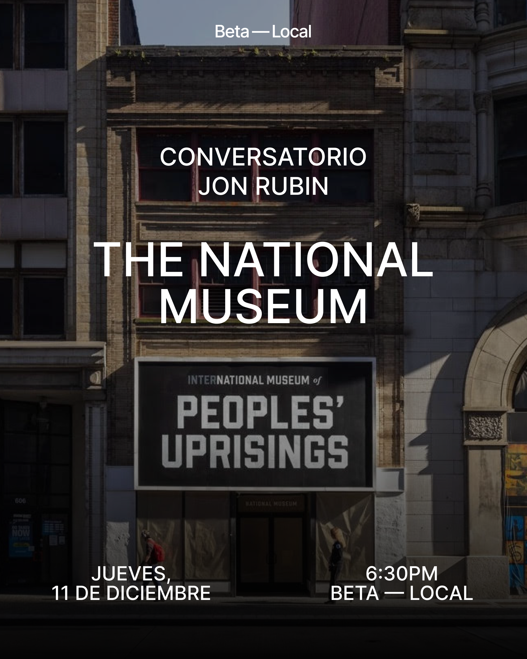 Les invitamos a una conversación junto al artista Jon Rubin (@jonrubinstudio ) para discutir su trabajo y su colaboración junto a Beta-Local a partir de su proyecto The National Museum (@the.national.museum ). El museo, que se encuentra en un proceso de cuestionar críticamente qué relatos, historias y futuros se consideran dignos de preservar y cuáles son ignorados u olvidados, periódicamente invita a un artista a cambiar el nombre de la institución y a un escritrorx a escribir un ensayo con el nuevo nombre como punto de partida. En su primer año, el proyecto incluyó rótulos en vitrinas, afiches en la calle, pliegos impresos, ensayos complementarios y presentaciones en el espacio público.